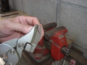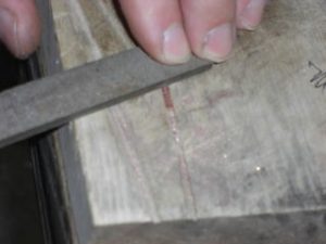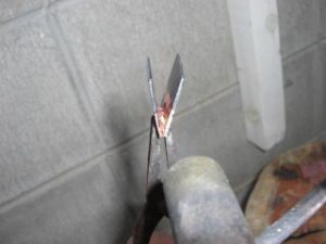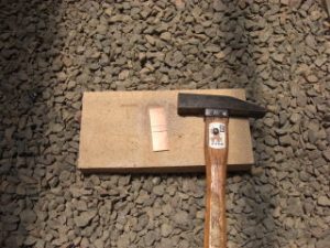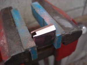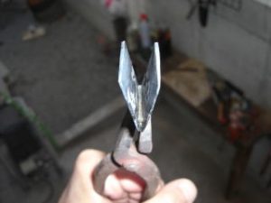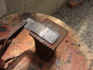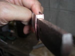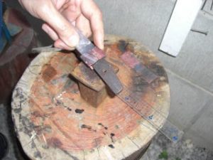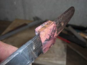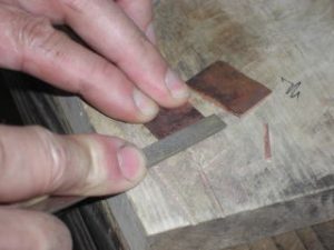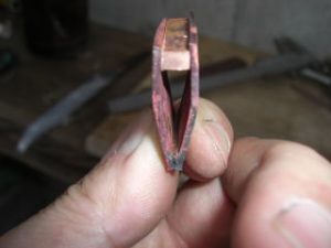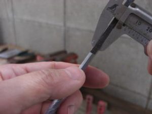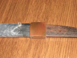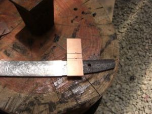 今天我收到一个信息,要求我上传一个较之前更为简单的鎺金制作方法。之前我出的制作教程,有人表示铜片在折叠时容易变圆,导致和刀身契合度不好,对新手友好度不足,操作经验要求比较高。提问者做的东西我看了,折叠部分圆了,与刃区接触部分不合适,所以基本上只能用牙啃了。 所以这次我放了个大招,使用了秘技使得刀身与鎺金更容易合称,并使折叠部分变得硬朗。 制作材料可以是:铜、银、黄铜,甚至是黄金的金属片。只要你够豪,动手能力够强,欢迎挑战制作。 首先我们来测量刀身的尺寸,V字形底部厚度1.8mm,顶部厚度4.7mm。选用2mm厚的铜板根据刀身高度准备好材料。